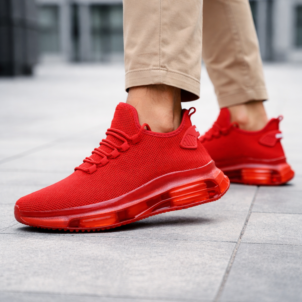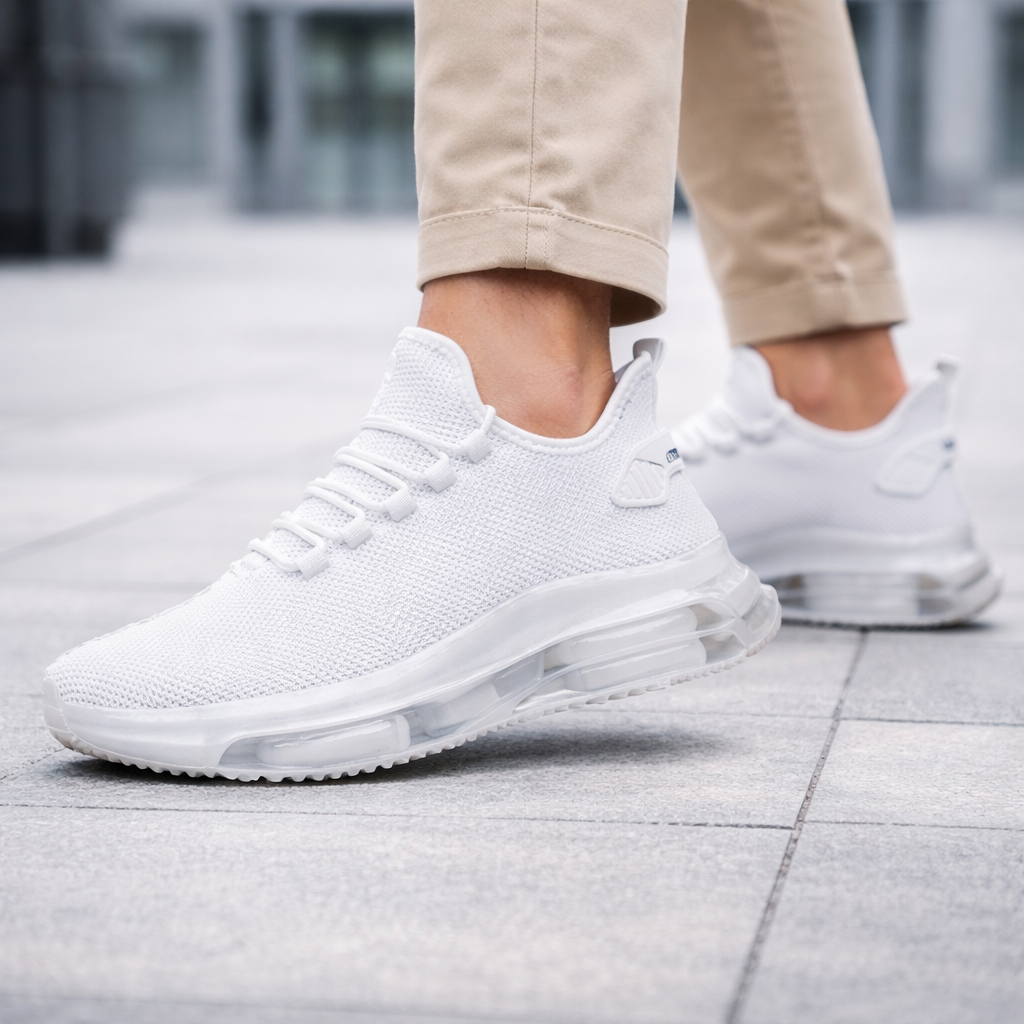 Lightweight knit runners with a low-profile silhouette and visible air-cushioned sole, designed for everyday wear, commuting, and casual movement with breathable comfort and a flexible, easy fit.